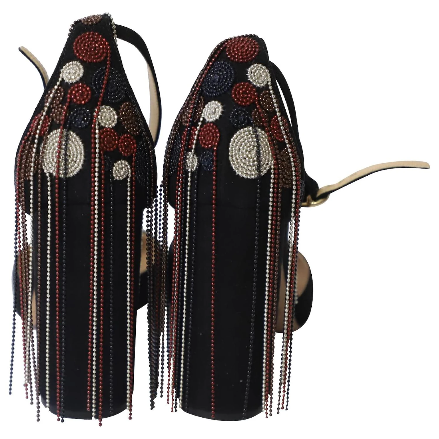 Affichez un look simpliste mais audacieux avec cette paire d’escarpins Liv D’orsay de Chloe. Fabriqué en Italie, elles sont en daim noir. Style avec bouts ronds, Sangles de cheville bouclées, 9.5 talons blocs de cm ornés de perles multicolores et de pompons en perles. Ils sont finis avec du matériel doré, Doublure en cuir, semelles et semelles.