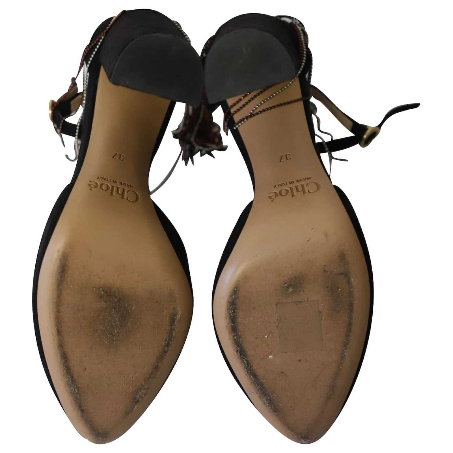 Signe d’usure : marques blanches très minimes à l’extérieur et marques noires à l’intérieur, éraflures sur les semelles et les talons
