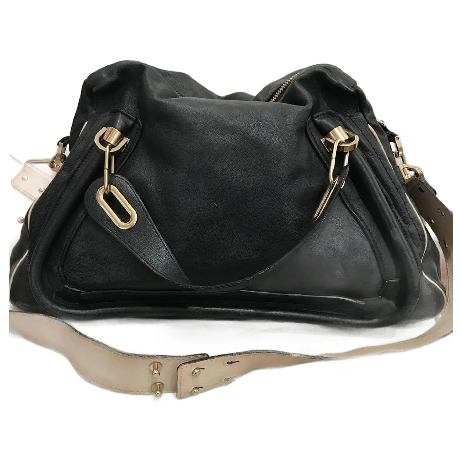 Sac Chloé, modèle Paraty, en cuir noir. Grand modèle avec anse bandoulière en cuir beige. une fermeture à glissière. Poches intérieures Dimensions : Largeur 47 cm x hauteur 30 cm x profondeur 9 cm. bien, quelques marques de frottement.