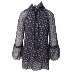 Des fleurs rêveuses accentuent ce chemisier en georgette transparente légère tandis qu’un col à nouer en trou de serrure à volants se termine avec une sensation polie.